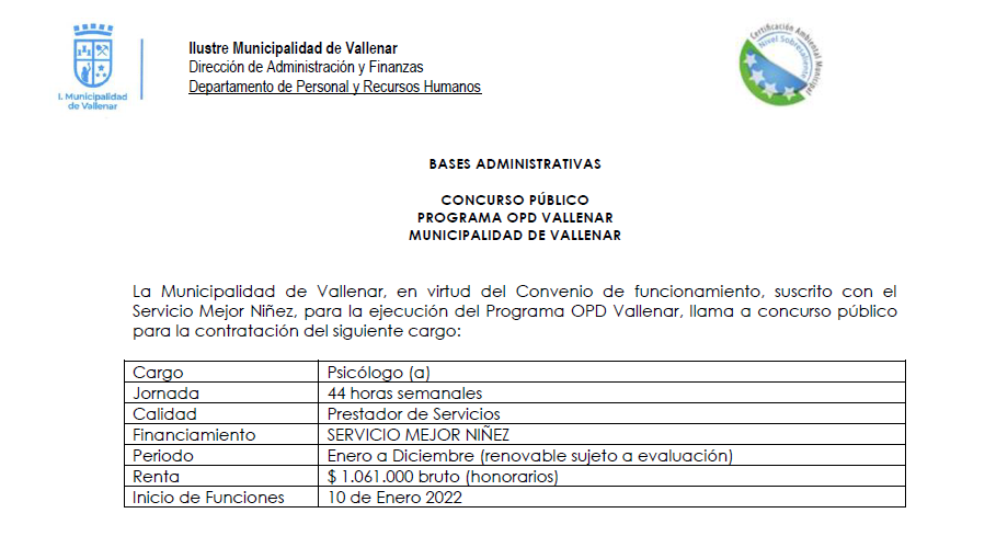 Segundo llamado a Concurso al cargo de “Psicologo/a” OPD Vallenar