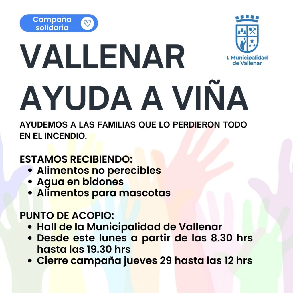 ¡Atención Vallenar! Desde hoy lunes 26, a partir de las 08:30 de la mañana, comenzaremos a recibir en el hall del edificio municipal todos vuestros aportes, consistentes en agua en bidones y en alimentos no perecibles. Y extenderemos este acopio de ayudas hasta el mediodía del jueves 29. AYUDEMOS A LAS FAMILIAS DE VIÑA DEL MAR QUE LO PERDIERON TODO EN ESTE SINIESTRO!!! VAMOS CON TODO VALLENAR!!!