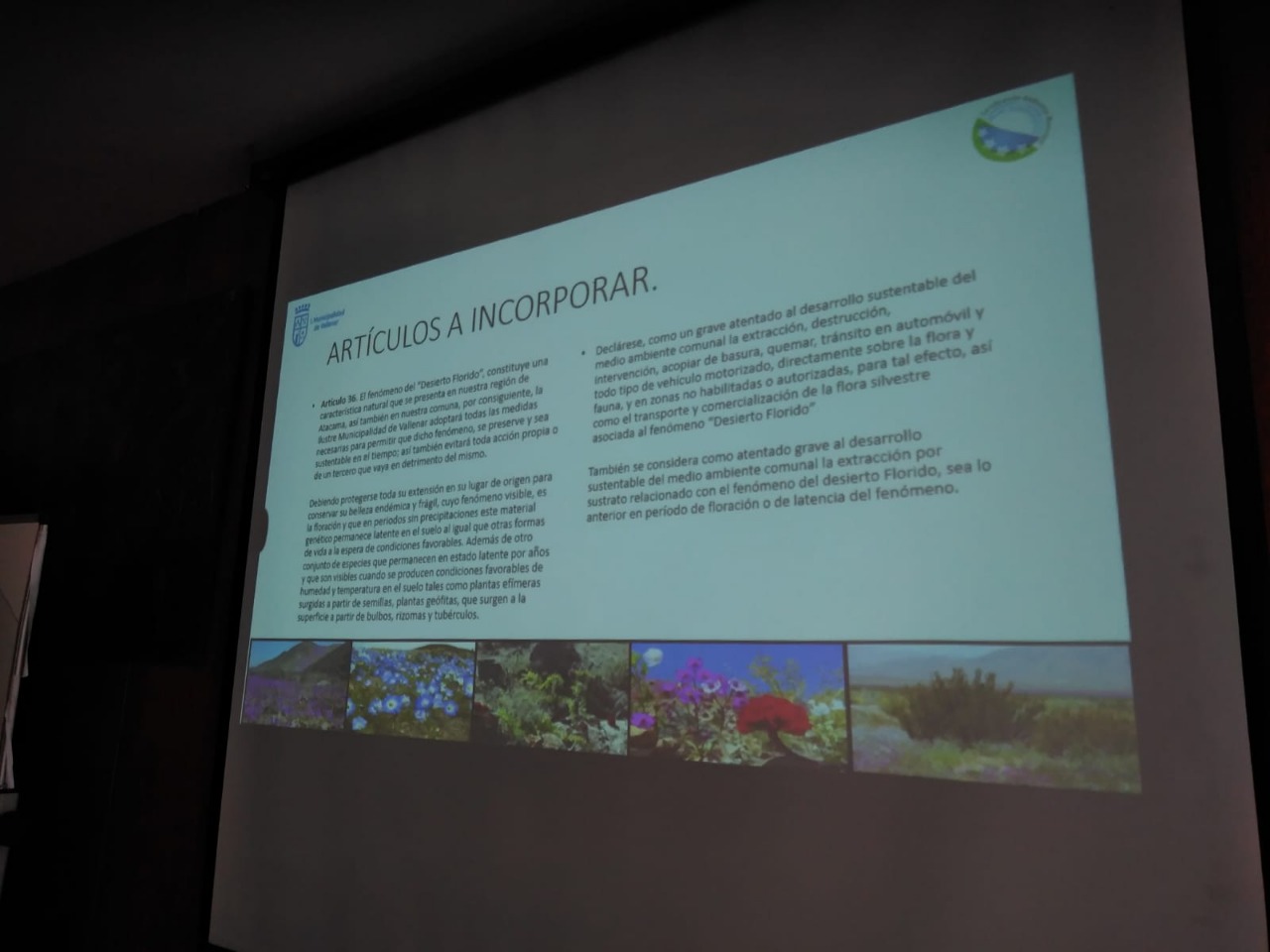“Declárese como un grave atentado al desarrollo sustentable del medio ambiente comunal, la extracción, destrucción, intervención, acopiar basura, quemar, tránsito en automóvil, y todo tipo de vehículo motorizado directamente sobre la flora y fauna, y en zonas no habilitadas o autorizadas para tal efecto, así como el transporte y comercialización de la flora silvestre asociada al fenómeno Desierto Florido” indicó Paloma Ibacache sobre uno de los artículos propuestos por el equipo de Medio Ambiente del municipio, señalando además la profesional que “la idea central es proteger a todo este patrimonio natural, tanto en época de floración como también de latencia. Por eso se habla de proteger la biodiversidad del Desierto Florido”