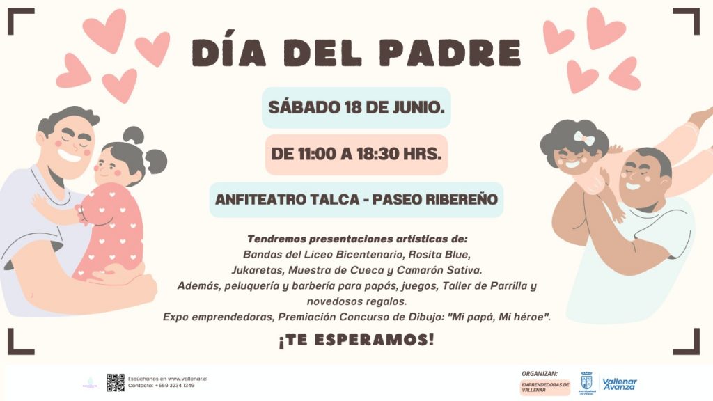 Este sábado 18 de junio, en el Anfiteatro Talca del Paseo Ribereño, se realizará la celebración del Día del Padre en Vallenar. Actividad que comenzará a eso de las 11.00 horas, y que dentro de los atractivos tendrá música en vivo, sesiones de barbería y peluquería, además de entretenidas dinámicas para que padres e hijos puedan interactuar y jugar.